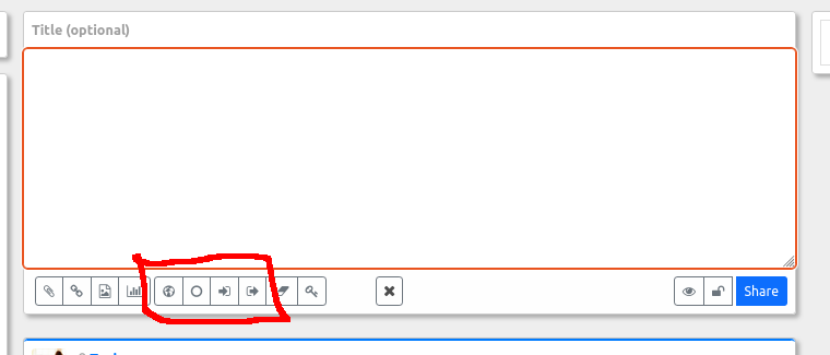 3. The next two buttons display any time geographic location is available in the post. They are "enter" and "leave" icons and are used here to to turn the current post into a "checkin" (Arrive) network activity or a "checkout" (Leave) activity. When either of these options are selected, the icon will change colour to indicate that the post is now a checkin/checkout activity and a map will be inserted into the post. You may add additional text or basically any content. Use the preview ("eye" icon) button to view the results without publishing or click 'Share' to share the post. Clicking one of these buttons a second time undoes the action and turns it back into a normal post.