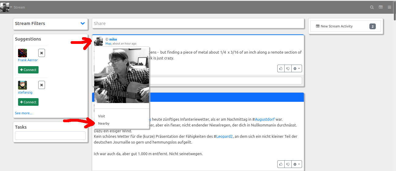 Any post which contains geographic coordinates can be used to search by distance. This allows you to quickly see (for instance) restaurant reviews by performing a distance search on any post near that restaurant. To perform a distance search, click on the avatar or photo of the post author. This opens a popup mini-panel with a number of options. If the post contains coordinates, one of these options will be "Nearby", which performs a distance search based on that post.